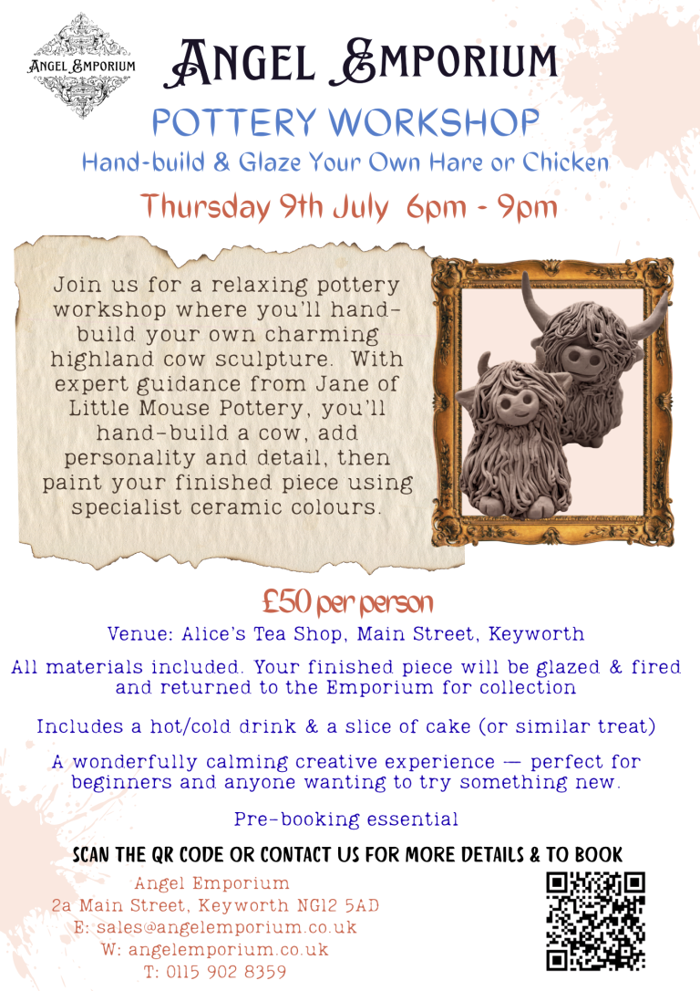 Join us for a relaxing pottery workshop where you’ll hand-build your own charming highland cow sculpture. Jane from Little Mouse Pottery will guide you step-by-step through shaping, adding details, and decorating your piece.